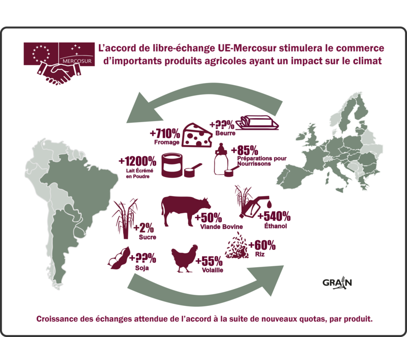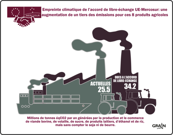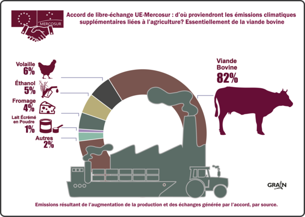 Os principais produtos agrícolas com impacto no clima são a carne bovina, aves e etanol do lado do Mercosul e o queijo pela Europa. Dois terços das novas emissões serão produzidos na fazenda, incluindo fertilizantes e esterco, enquanto quase 30% virão de mudanças no uso do solo, incluindo o desmatamento. E, embora grande parte do incentivo para aumentar a produção e o comércio provenha de cotas e direitos aduaneiros, o TLC impõe igualmente regras em matéria de indicações geográficas, o que criará novos direitos de mercado na América Latina para os produtores de queijo europeus. Por último, é de notar que, embora o Mercosul venha a gerar a maior parte destas novas emissões, as emissões resultantes do crescimento das exportações de produtos lácteos da UE para o Mercosul aumentarão 497%.