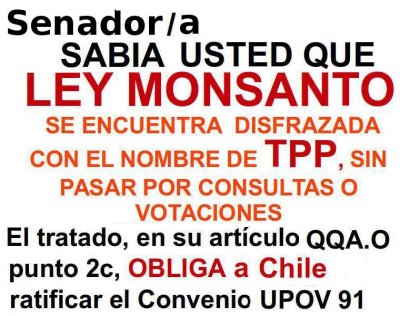 La campaña Yo No Quiero Transgénicos en Chile (YNQT) impulsa la interpelación directa a parlamentarios sobre el TPP con el fin de saber su voto y ubicarlos en lista "Verde" o "Roja".