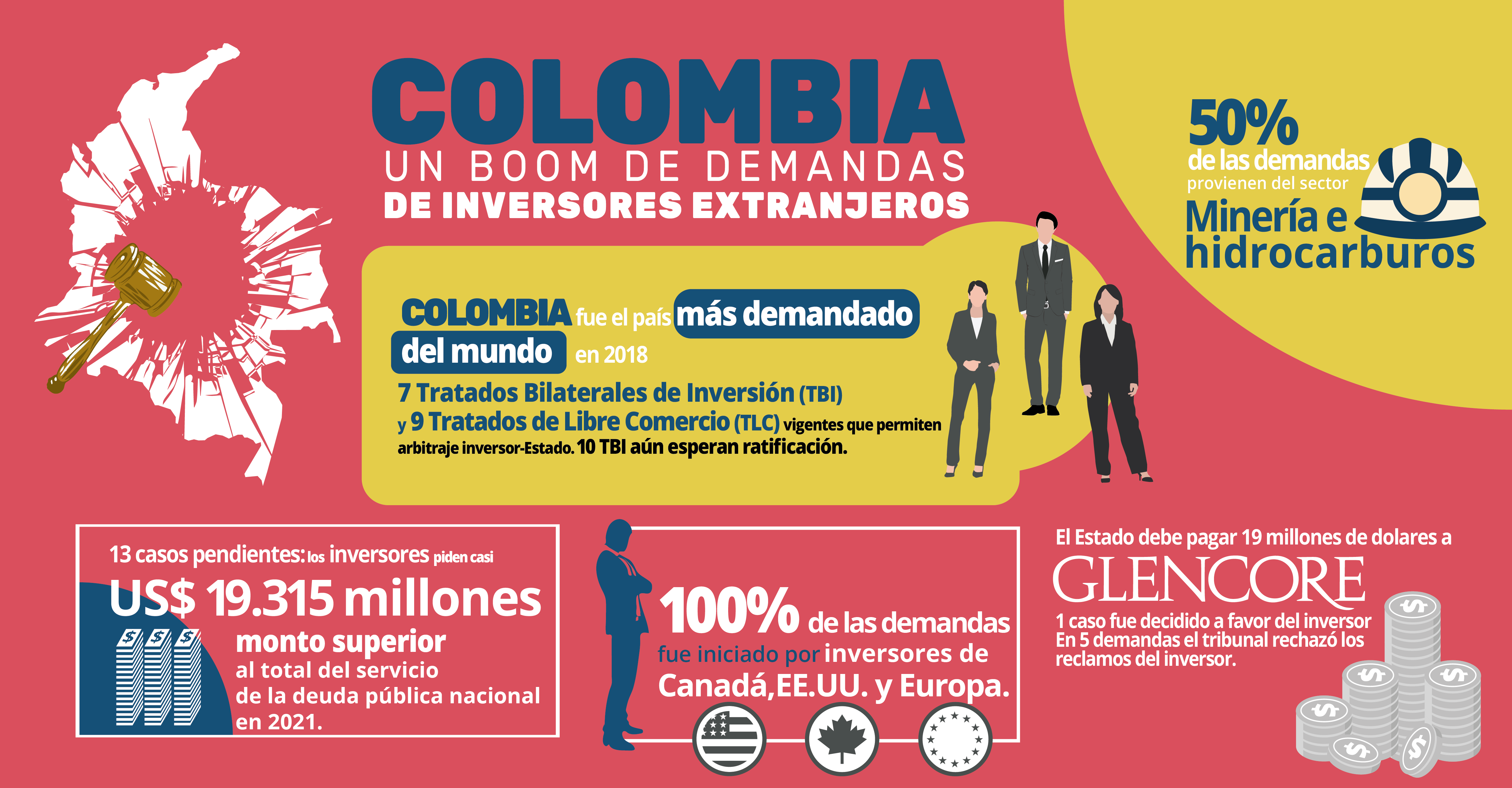 En 2018, Colombia fue el país más demandado ante tribunales de arbitraje internacional por parte de inversores extranjeros. Desde el principio del nuevo milenio, los gobiernos de Álvaro Uribe y Juan Manuel Santos apuraron la firma de tratados bilaterales de inversión y de libre comercio sin ningún tipo de debate público ni estudio de impacto medioambiental o social.