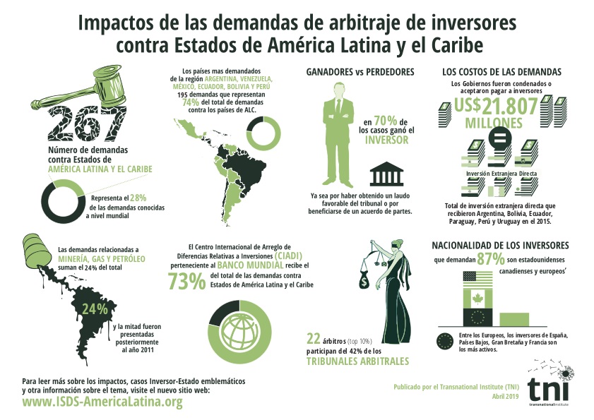 22 de los 42 países en la región ya han sido demandados a través del sistema de arbitraje de inversores (ISDS). El 73,8% de las demandas fueron hacia Argentina, Venezuela, México, Ecuador, Bolivia y Perú.