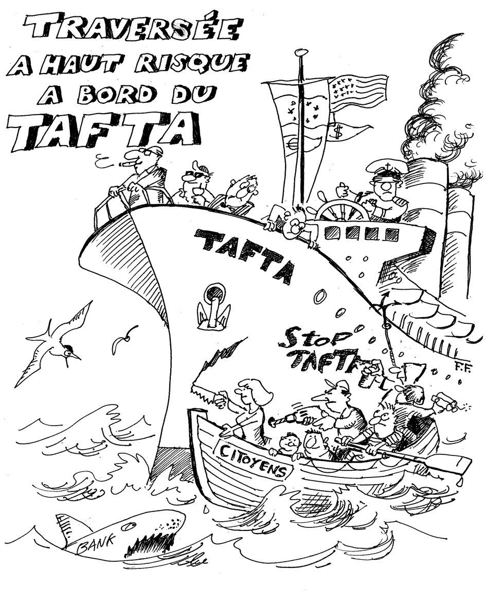 En février 2013, le président états-unien Barack Obama a profité du discours sur l'état de l'Union pour annoncer le lancement d’un accord global de commerce et d’investissement entre les Etats-Unis (USA) et l’Union européenne (UE). Le premier cycle des négociations, en juillet de cette même année, remettait à l’ordre du jour un vieux rêve des lobbyistes du Dialogue économique transatlantique; ils insistaient, depuis les années 90, pour la mise en place d’un accord dit de « libre-échange » entre les deux territoires. Le Partenariat économique pour le commerce et l’investissement (PTCI, TTIP ou TAFTA, selon les régions) a cependant l’ambition d’aller bien plus loin que tout autre accord commercial antérieur. Il touche à des domaines très élargis, de façon à réaménager le paysage socio-économique de chaque côté de l’Atlantique au bénéfice du capital.