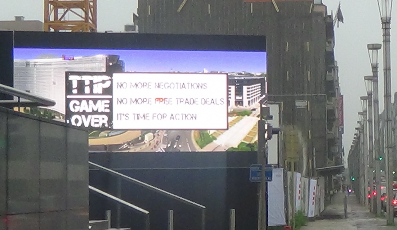 Un militant anti-TTIP devant le tribunal pour avoir piraté l'écran place De Brouckère