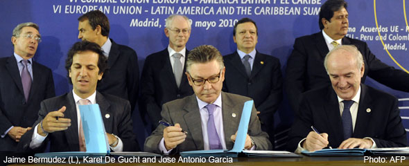 The European Union on Wednesday signed agreements liberalizing trade with Central America, Peru and Colombia, while some Latin American leaders criticized such deals as only favouring rich countries.