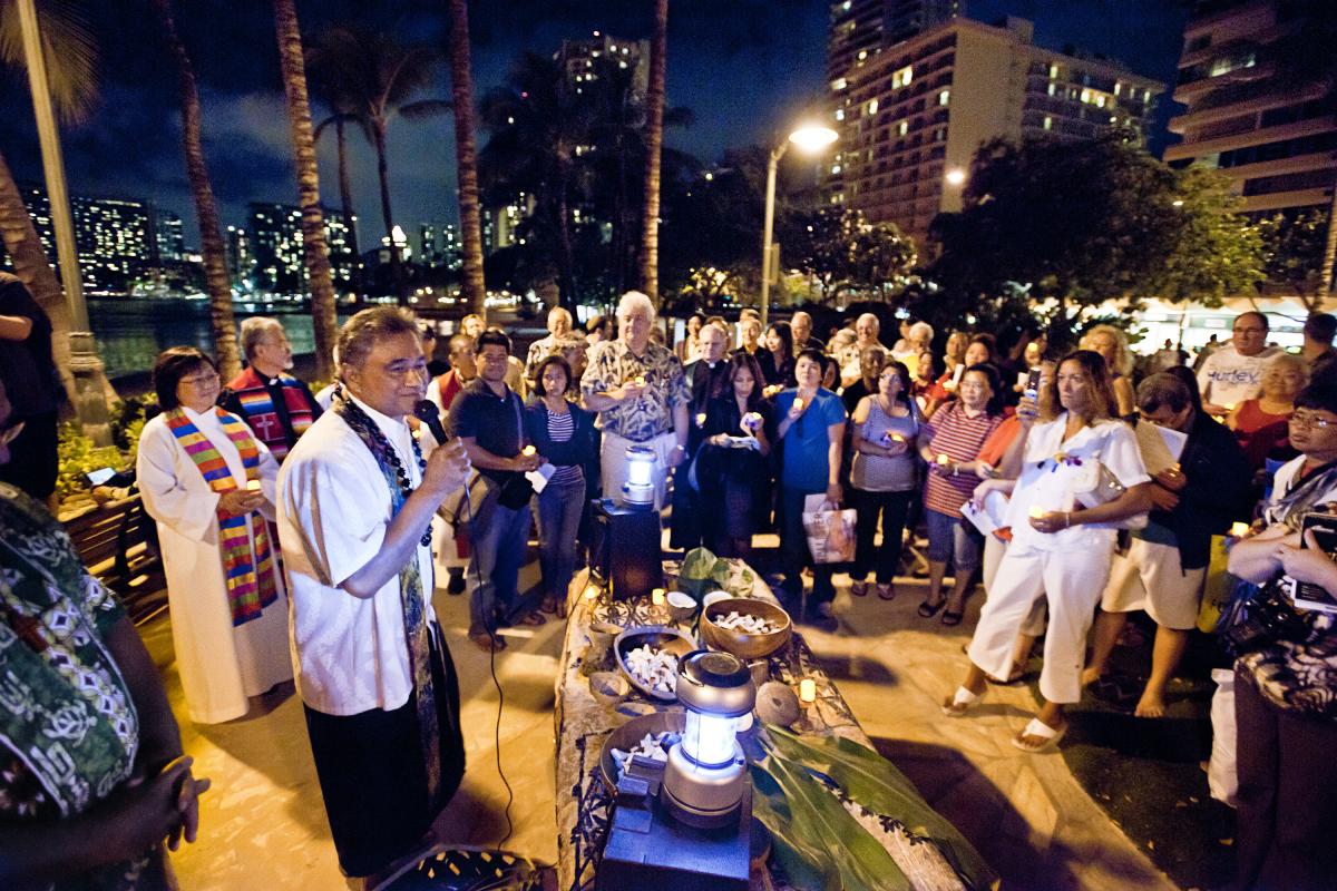 More than 30 clergy from a dozen denominations led hundreds of followers out of St. Augustine's Catholic Church in Waikiki on Monday night and into the streets of Waikiki as a challenge to APEC, the international trade talks kicking off tomorrow in Honolulu, Hawaii.