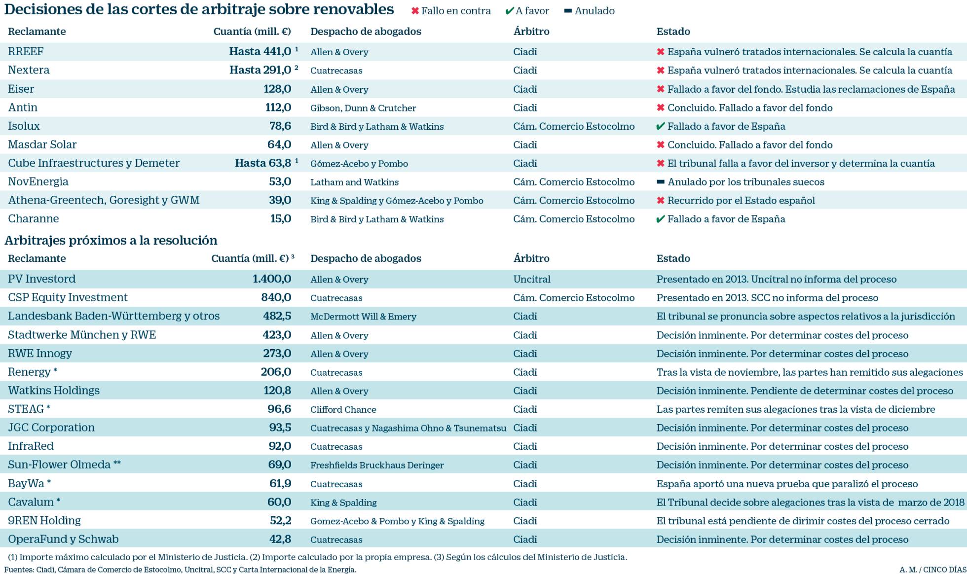 El 31 de mayo el Estado español fue condenado a pagar 41,8 millones de euros a la sociedad radicada en Luxemburgo 9REN Holding tras perder el arbitraje de inversiones interpuesto ante el CIADI.