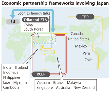 Shinzo Abe's recent announcement that Japan aims to join the Trans-Pacific Partnership trade negotiations has sparked life into other trade talks Japan has aimed to start, with those for an economic partnership agreement with the European Union the latest example.