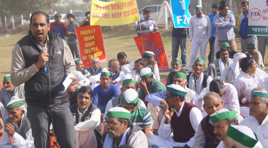 As negotiators from 16 nations meet in New Delhi for 5 day consultations on the Regional Cooperation Economic Partnership (RCEP), farmers, trade unions, retailers groups, and civil society organisations protested outside the India Expo Mart in Greater Noida. RCEP is a complex North South Free Trade Agreement (FTA) that India is negotiating with the 10 member ASEAN block plus Japan, China, South Korea, Australia and New Zealand.