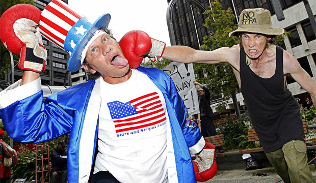 Activist group Aotearoa is Not for Sale Wellington staged a symbolic boxing match protesting the Trans-Pacific Partnership Agreement today.