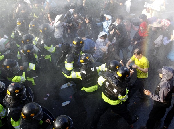 South Korean authorities have detained at least 15 people after police clashed with protesters demonstrating against the country’s free-trade agreement with the US.