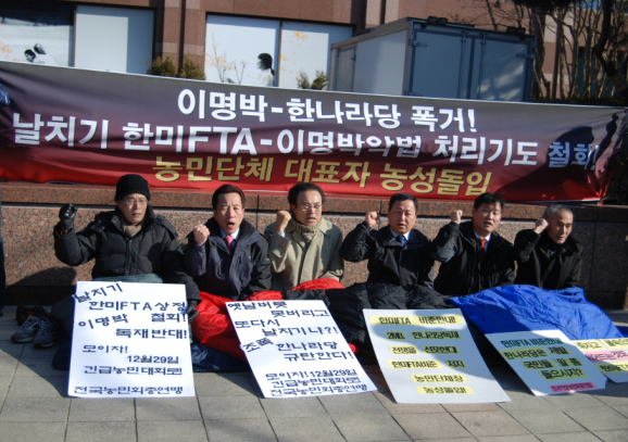Representatives of peasant organizations in south Korea went into an all-night sit-in strike in Seoul on Dec. 22 to check the passage of the motion calling for the ratification of the south Korea-US FTA through the National Assembly.