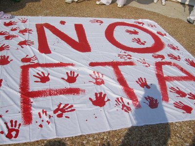 Koreans from all over the U.S. and abroad at the first ever U.S. Social Forum marked the official June 30 signing of the Korea-U.S. Free Trade Agreement (FTA) with an “anti-FTA signing ceremony”. Leaders of people's movements from Korea and the U.S. spoke out against the devastating consequences of NAFTA-style free trade.