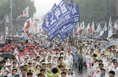 Tens of thousands of workers and anti-US activists rallied Friday in central Seoul in monsoon rains to oppose a free trade agreement (FTA) between South Korea and the United States.