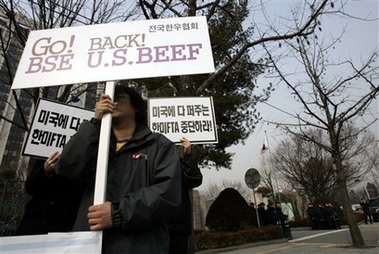 This was not the end, however. Two weeks later, newly elected Korean President Lee Myung-Bak travelled to Washington to sign the FTA. While there, on 18 April, the two governments inked yet another side deal that the US insisted was necessary for the FTA to go through. This deal laid out explicit rules on how Korea was to open its market in the broadest way to US beef imports, despite concerns about mad cow disease. The adoption of this secret pact triggered off what became known as the "beef crisis" in Korea. Students, mothers and consumers raised a fury of candlelight protests and other actions that by June 2008 had ministers resigning and the president own tenure under threat.