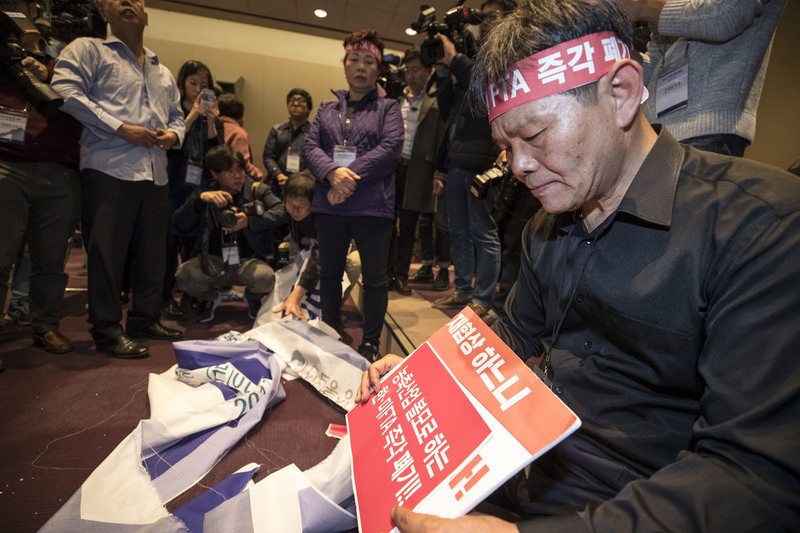 South Korea held a public hearing on the free trade agreement with the United States to collect opinions from different circles, but it was disrupted by angry farmers and livestock breeders who claimed massive damage from the market opening.