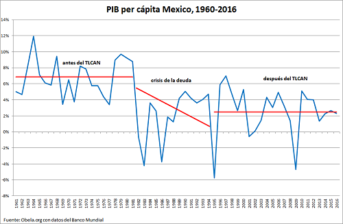 El TLCAN, calificado de “sentencia de muerte” para los campesinos y pueblos indígenas mexicanos, ha provocado una resistencia fuerte y sostenida de un amplio espectro de la población mexicana. Fue uno de los catalizadores del levantamiento zapatista. Desde que entró en vigor, el maíz barato subvencionado de los Estados Unidos inundó el mercado mexicano, vendido a precios por debajo del costo de producción, con lo cual los campesinos no pueden competir. Casi dos millones de empleos se perdieron en el sector agrícola en el TLCAN durante los primeros diez años: esto ha llevado a desplazamientos masivos, pobreza y hambre.